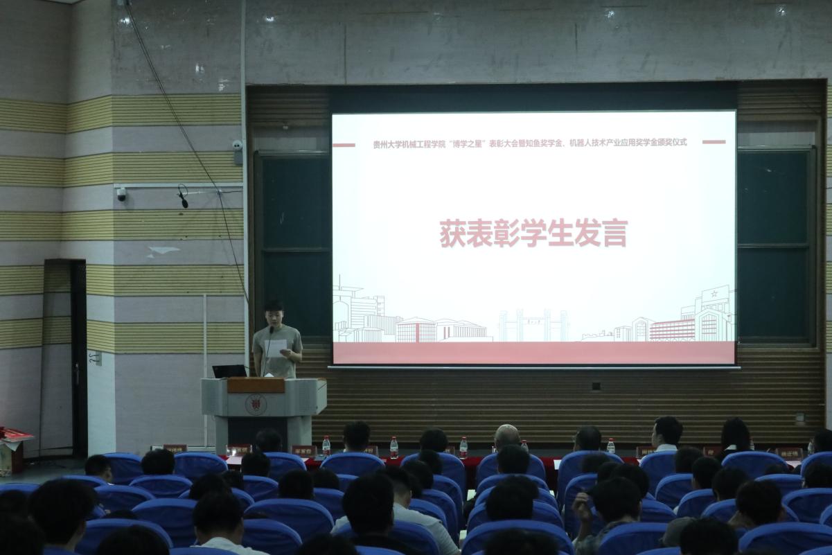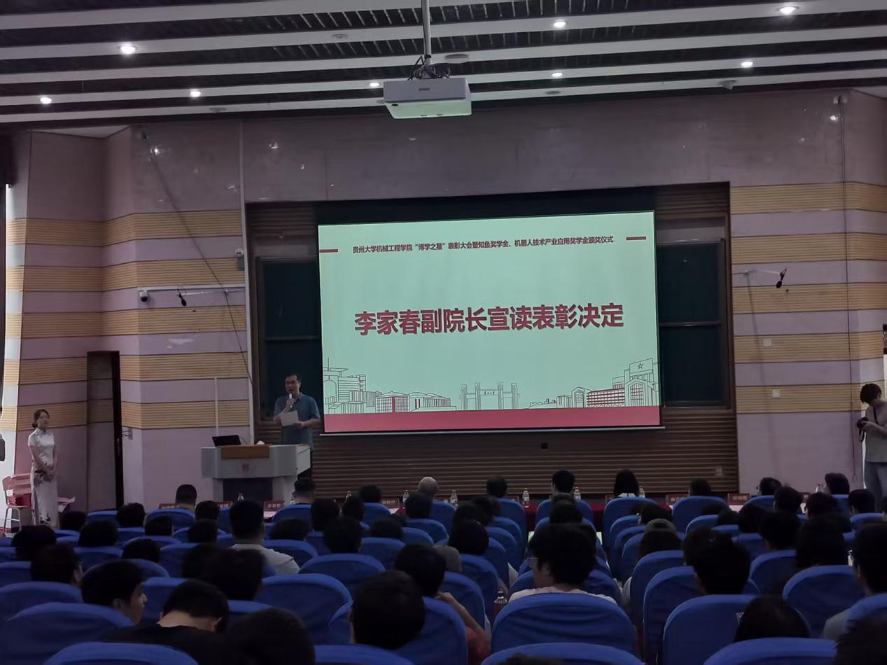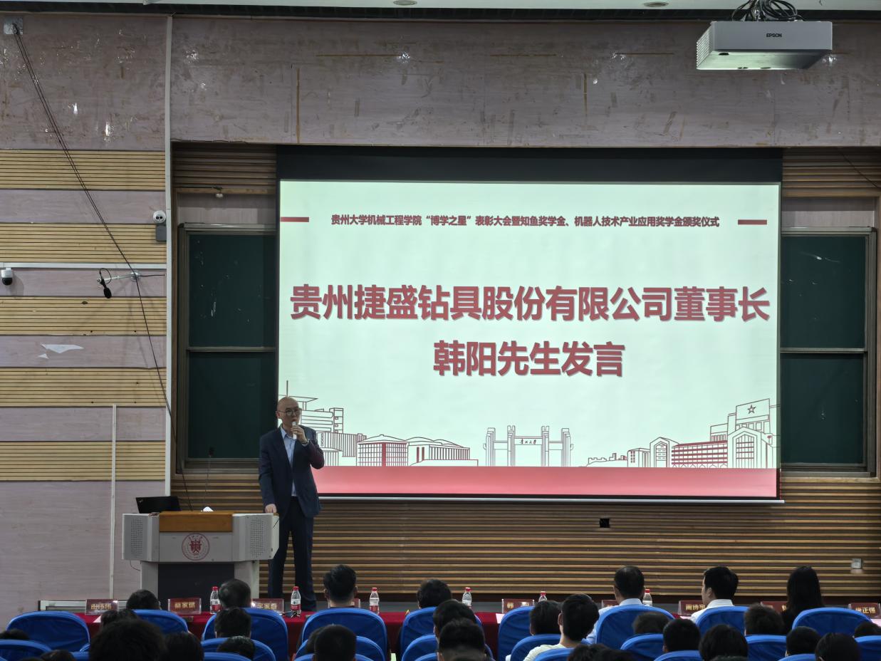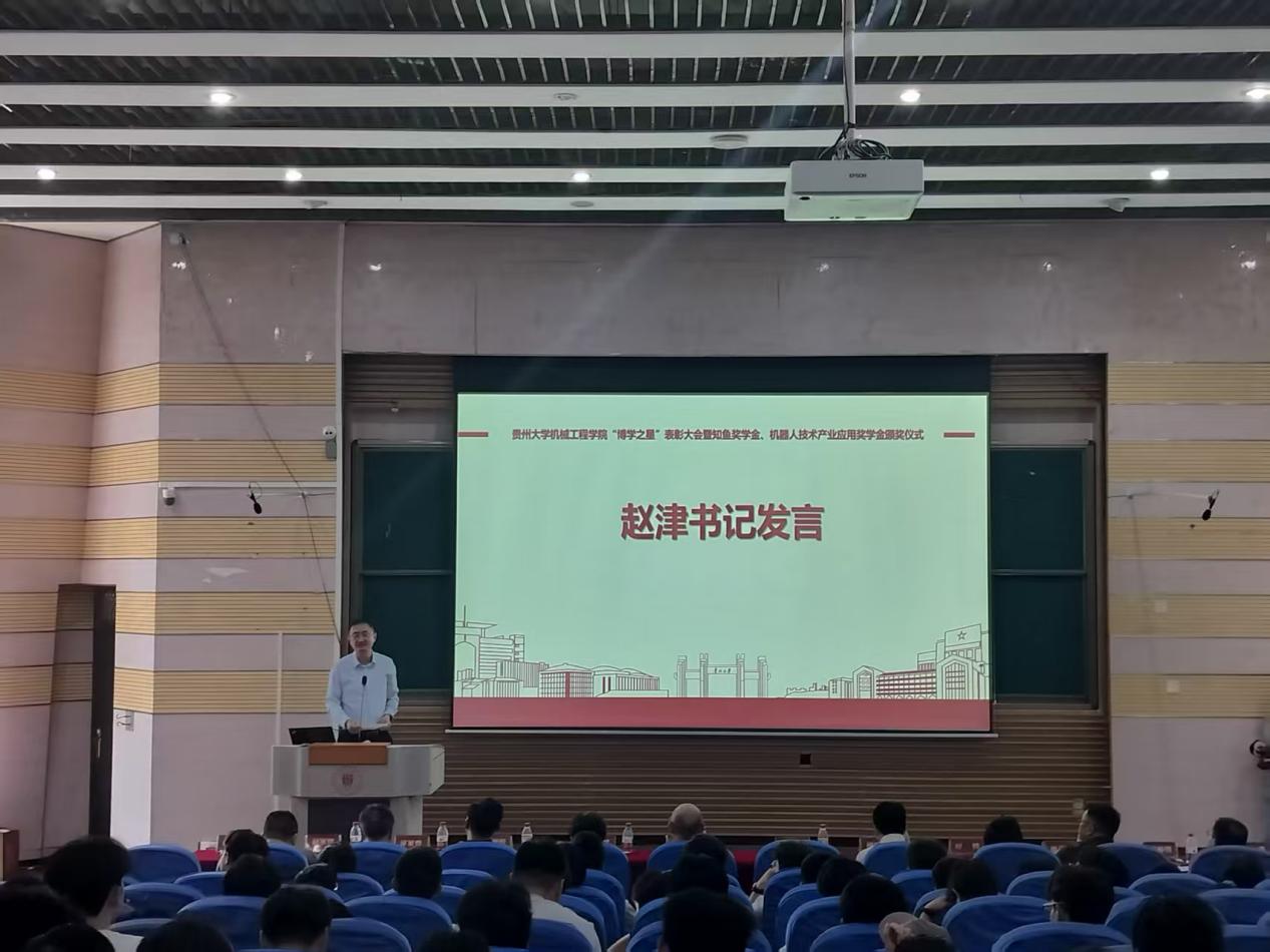 為表彰在學習成績、科研創(chuàng)新等方面有突出表現的畢業(yè)班同學,2024年6月27日下午,貴州大學機械工程學院“博學之星”表彰大會暨知魚獎學金、機器人技術產業(yè)應用獎學金頒獎儀式在西校區(qū)117報告廳舉行。貴州捷盛鉆具股份有限公司董事長韓陽、重慶安尼森智能科技有限公司技術總監(jiān)周詩宇、貴州捷盛鉆具股份有限公司供應鏈總監(jiān)安燕、國際業(yè)務二部部長周舒毅、企劃部主管田偉偉與機械工程學院黨委書記趙津、正處級組織員董蔚然、黨委副書記廖燁、副院長李家春、副院長唐正強出席會議,學生科全體輔導員、獲獎學生代表及兩百余名機械學子參會,大會由學生科副科長王嘉斌主持。