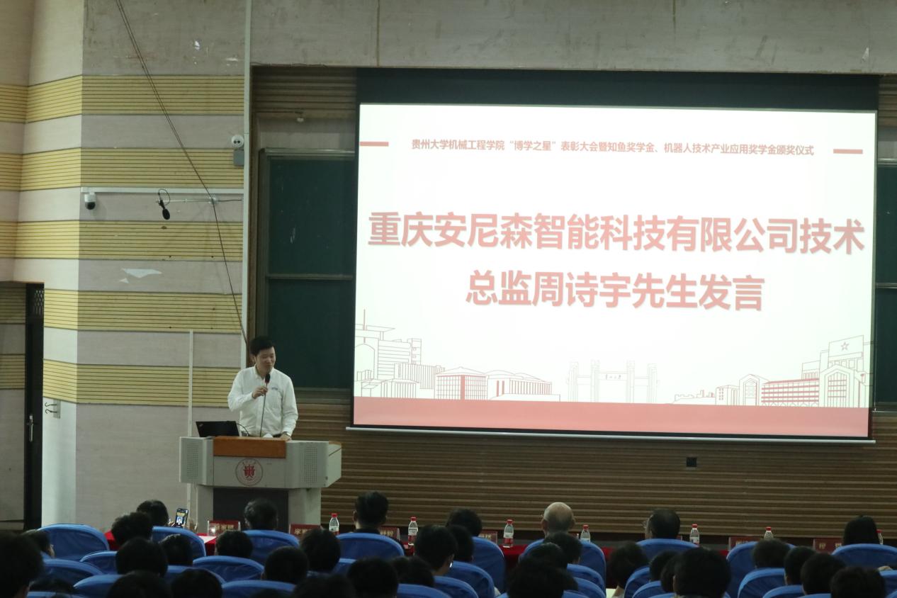 韓陽先生介紹企業(yè)艱難的發(fā)展過程,遇到的難題及解決辦法,鼓勵同學們要堅持克服困難努力拼搏。同時也強調人才對于制造業(yè)升級的關鍵作用,希望機械學子爭做復合型人才,并對獲獎學子寄予厚望,期待未來有更多機械學子加入產業(yè)報國行列。重慶安尼森智能科技有限公司技術總監(jiān)周詩宇講述他的成長經歷,分享科技創(chuàng)新心得,鼓勵同學們夯實基礎、勇于探索,積極投身智能制造領域,為產業(yè)發(fā)展賦能新質生產力。