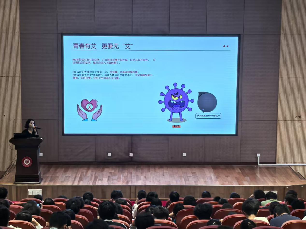 大會第二階段,學(xué)生科輔導(dǎo)員楊朵老師開展防艾宣傳,從艾滋病的傳播途徑、預(yù)防措施、等方面進行講解,著重強調(diào)樹立健康觀念、提高自我保護意識的重要性,引導(dǎo)新生們科學(xué)認(rèn)識艾滋病,養(yǎng)成良好的生活習(xí)慣,遠(yuǎn)離高危行為。同時,輔導(dǎo)員楊朵老師還向新生們介紹校醫(yī)院公眾號的重要欄目及使用方法,方便新生日后隨時獲取醫(yī)療健康服務(wù)保障。