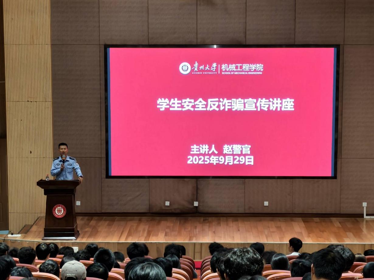 為提升機(jī)械學(xué)子的網(wǎng)絡(luò)安全意識,提升反詐能力,營造安全穩(wěn)定的校園環(huán)境,2025年9月29日晚,機(jī)械工程學(xué)院邀請松山派出所副所長趙普林警官開展新生反詐宣講大會,大會由學(xué)生科輔導(dǎo)員周士力主持,2025級全體新生參會。