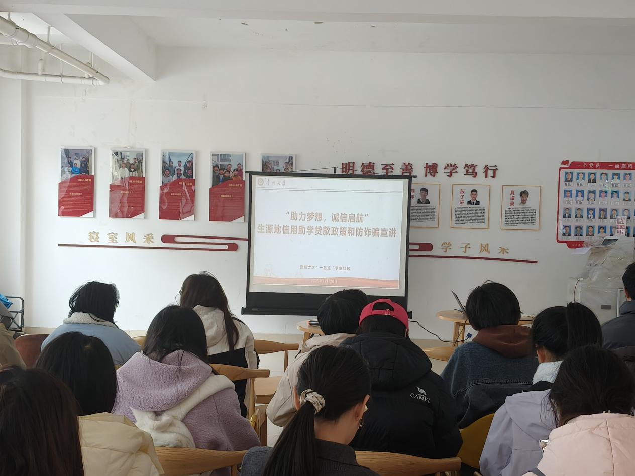 機(jī)械工程網(wǎng)站訊(文/楊朵圖/王則皓)為做好生源地信用助學(xué)貸款政策宣傳,增強(qiáng)學(xué)生誠信還貸與防詐騙意識(shí),2025年11月20日中午,貴州大學(xué)機(jī)械工程院學(xué)聯(lián)合國家開發(fā)銀行貴州省分行、貴州大學(xué)學(xué)生資助管理中心在西一區(qū)6棟一樓大廳舉辦“一站式”學(xué)生社區(qū)之“助力夢想,誠信啟航”生源地信用助學(xué)貸款政策和防詐騙宣講會(huì)。國家開發(fā)銀行貴州省分行客戶三處三級(jí)經(jīng)理董婷婷主講,貴州大學(xué)學(xué)生資助管理中心副主任鄭嵐、機(jī)械工程學(xué)院黨委副書記廖燁、貴州大學(xué)學(xué)生資助管理中心相關(guān)科室負(fù)責(zé)人、機(jī)械工程學(xué)院輔導(dǎo)員代表與學(xué)生代表共40余人參與。