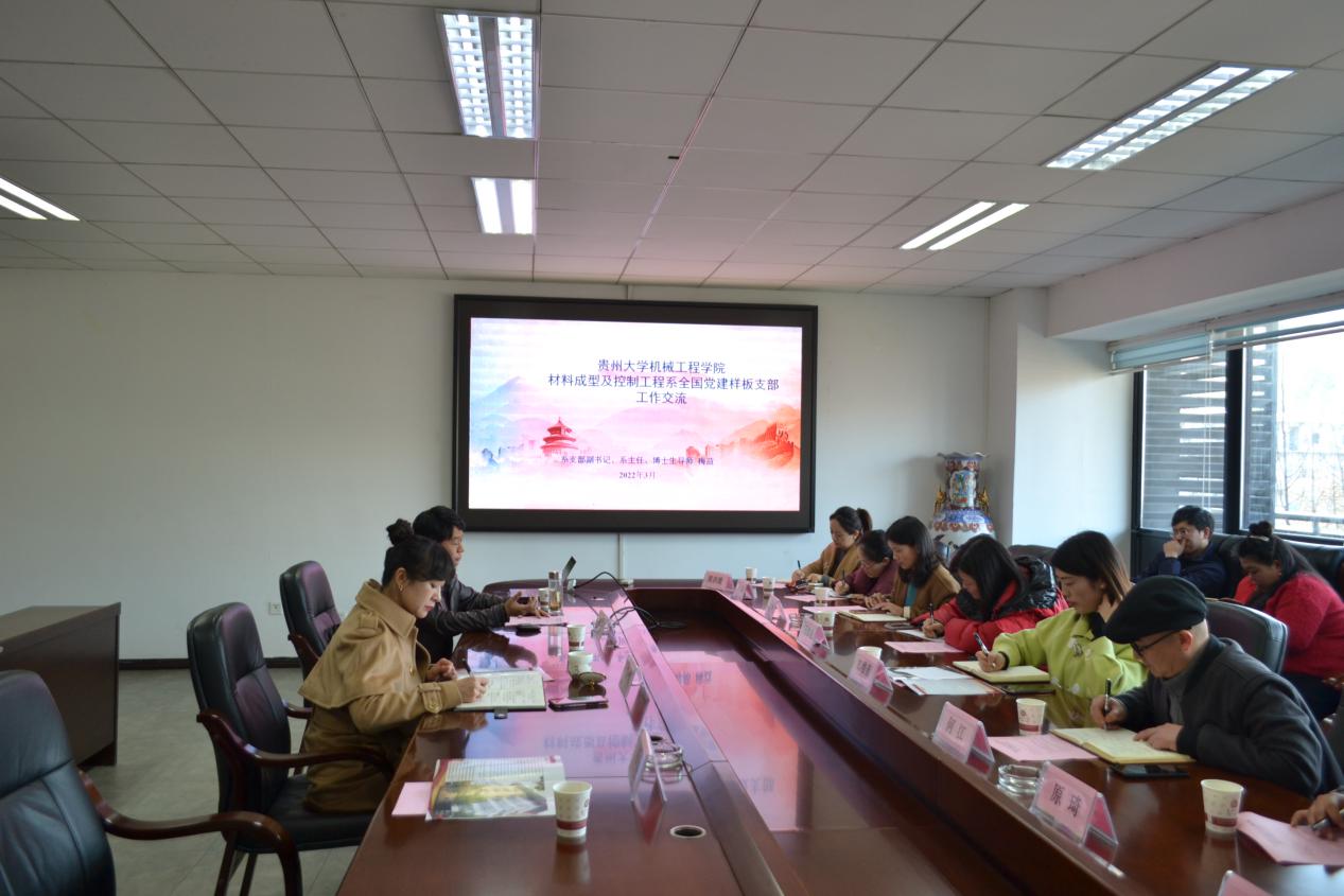 會(huì)上,廖燁對(duì)鄭維薇一行來訪表示熱烈歡迎,介紹了學(xué)院黨建的總體情況,重點(diǎn)圍繞以高質(zhì)量黨建工作助推學(xué)校高質(zhì)量發(fā)展詳細(xì)介紹了機(jī)械工程學(xué)院在“五個(gè)一”“五融合”方面的一些做法和亮點(diǎn)。楊勤介紹了機(jī)械學(xué)院的辦學(xué)歷史、學(xué)科發(fā)展的總體情況,希望以交流促合作,攜手共發(fā)展。隨后鄭維薇介紹了貴州醫(yī)科大學(xué)公共衛(wèi)生與健康學(xué)院黨建情況。最后,梅益介紹了全國黨建樣板黨支部——材料成型系教工黨支部建設(shè)情況,著重?cái)⑹隽藚⒃u(píng)全國黨建樣板黨支部的過程和驗(yàn)收工作,強(qiáng)調(diào)教工黨建要結(jié)合學(xué)科特色,要做到用心科研、服務(wù)社會(huì)、教育學(xué)生。隨后雙方就黨建工作進(jìn)行熱烈交流。