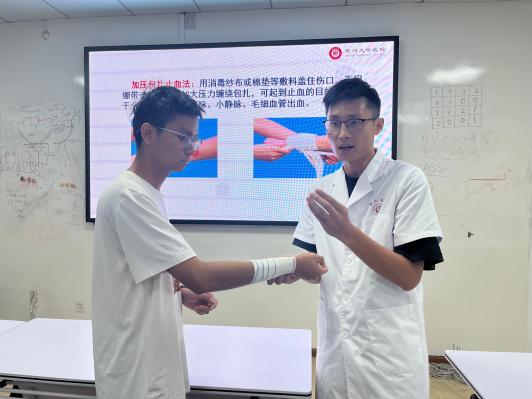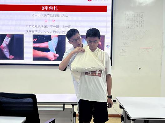接著,姚云騫老師分享了關(guān)于“創(chuàng)傷救護(hù)”的急救知識(shí)。他普及一個(gè)“先救命,后治傷”的救護(hù)原則,并現(xiàn)場演示了直接壓迫止血,加壓包扎止血,8字包扎法,三角巾膝關(guān)節(jié)帶式包扎,骨折固定等救護(hù)方法。