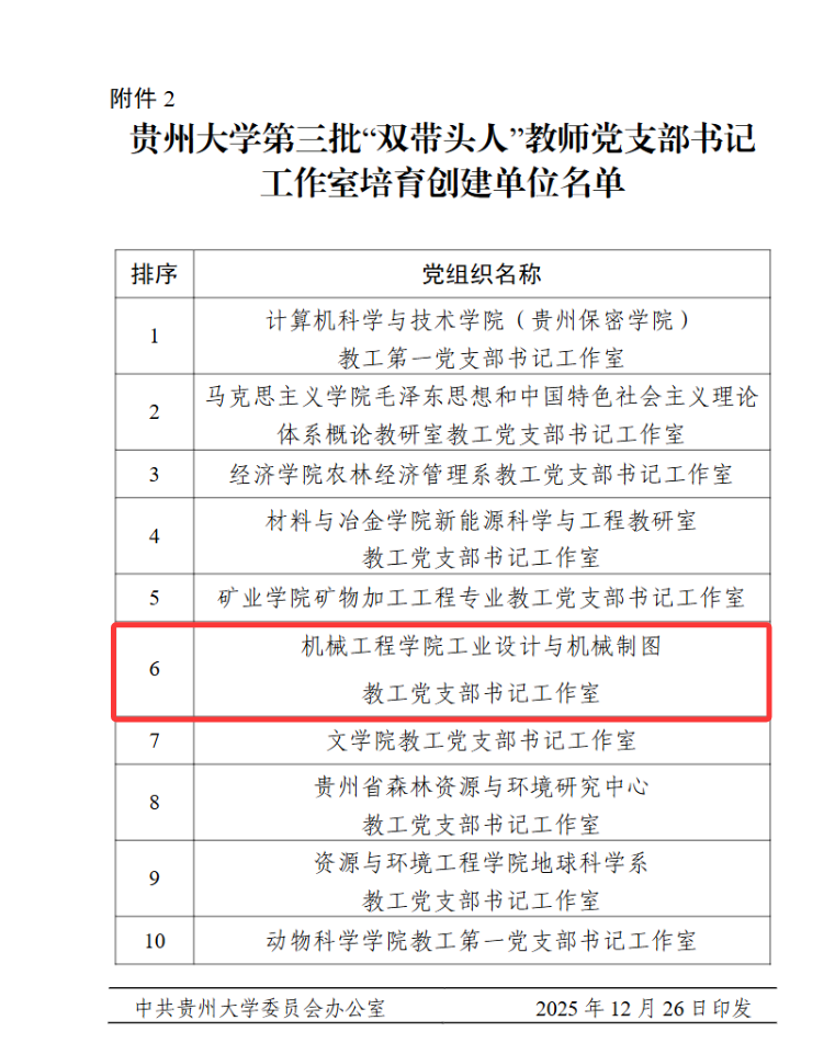 202512月,經(jīng)基層黨委把關(guān)推薦、專家評(píng)審、校黨委黨建工作領(lǐng)導(dǎo)小組辦公室審議、校黨委黨建工作領(lǐng)導(dǎo)小組審定,貴州大學(xué)第四批黨建工作“標(biāo)桿黨委”“樣板支部”和第三批“雙帶頭人”教師黨支部書記工作室培育創(chuàng)建單位名單發(fā)布,我院工業(yè)設(shè)計(jì)、機(jī)械制圖教工黨支部喜獲貴州大學(xué)第三批“雙帶頭人”教師黨支部書記工作室培育創(chuàng)建單位。
